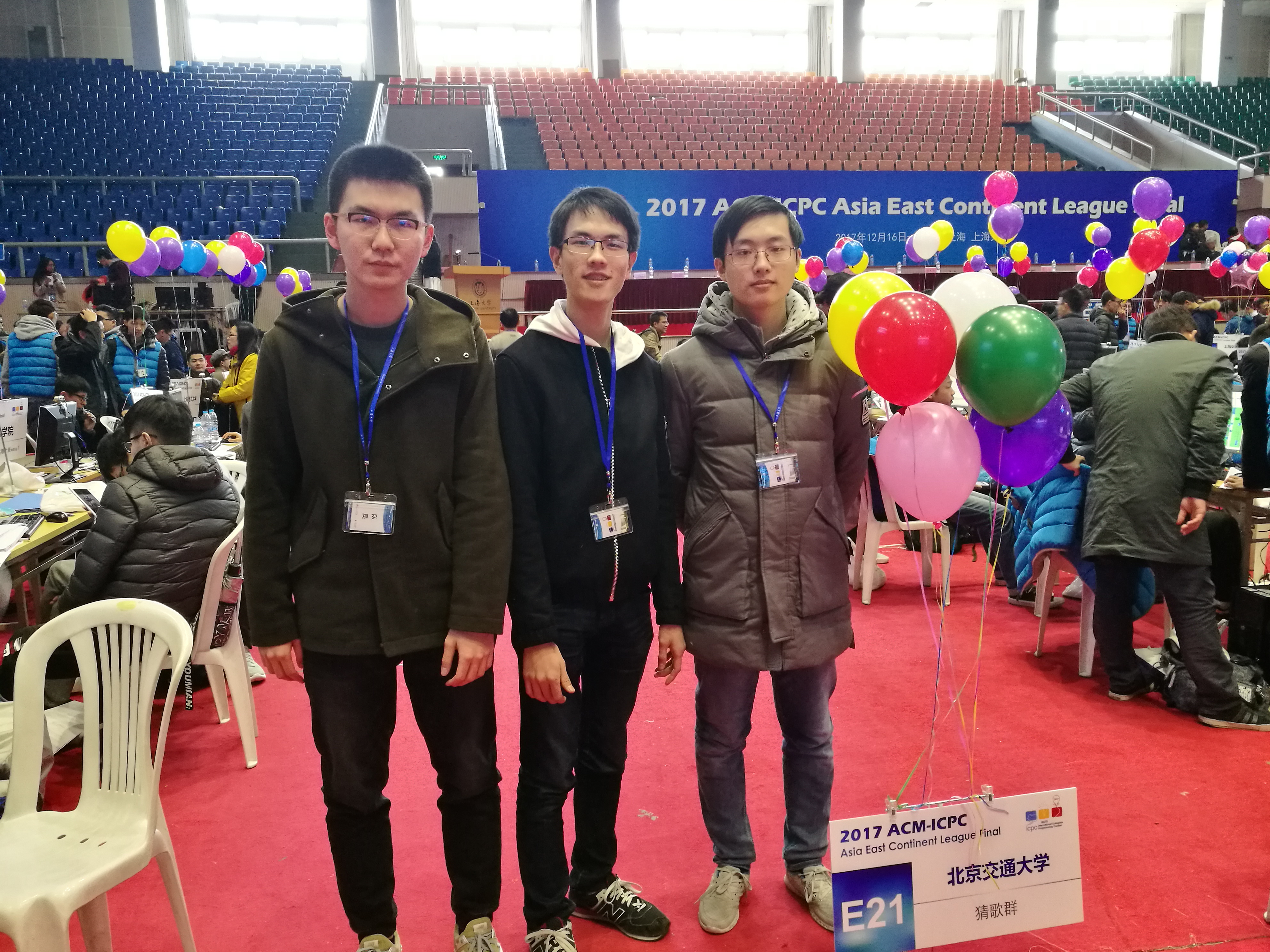 KY开元官网派出了两支参赛队伍参赛,分别是何卫锋(16281226)、郑黎明(14301166)、王天舒(15281132)组成的“猜歌群”队,陈炳君(16281031)、赵思达(16301057)、李孟韬(16281102)组成的“火箭鸡”队。经过5个小时的顽强拼搏,“猜歌群”队以解出8题的成绩排名总榜第43位,获得一枚银牌,“火箭鸡”队解出4题,因罚时过多与奖牌失之交臂。