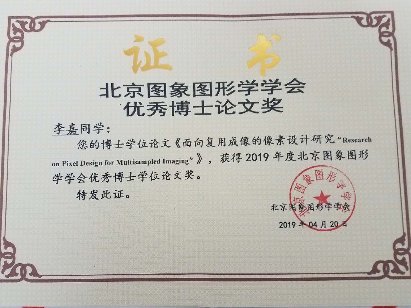 其中,KY开元官网于剑教授和林宙辰教授(北京大学)联合指导的博士研究生李嘉(下图右一)的博士学位论文《面向复用成像的像素设计研究》荣获北京图象图形学学会2019优秀博士学位论文奖。