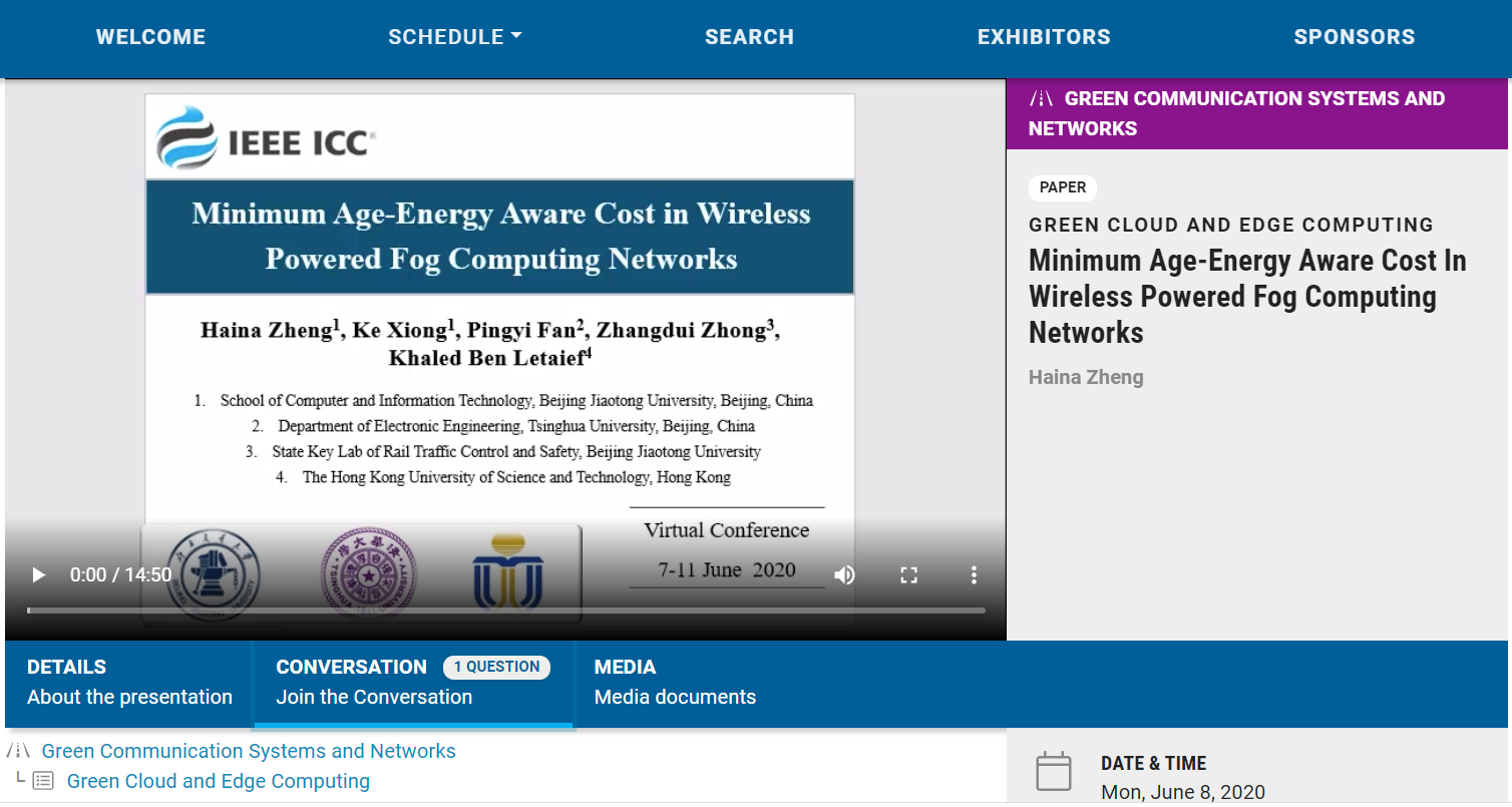 6月7日-6月11日,原定于爱尔兰都柏林召开的第54届IEEE国际通信大会(IEEE International Conference on Communication, IEEE ICC)受COVID-19疫情影响改在线上召开。由计算机学院信息通信网络研究所和轨道交通控制与安全国家重点实验室合作完成的学术论文“Minimum Age-Energy Aware Cost in Wireless Powered Fog Computing Networks”经过专题技术委员会评审和推荐,从提交的近2100余篇论文中脱颖而出,荣获最佳论文奖(Best Paper Award)(本次IEEE ICC最佳论文奖获奖比例为0.72%)。