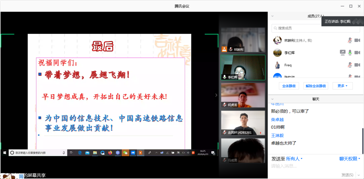 本次活动由李红辉老师、班长林映利以及团支书余其轩同学共同策划组织,旨在创造一个任课老师与毕业班同学线上互动交流的机会,能够让老师们为同学们以后的发展给出经验和建议,让同学们互相交流分享毕业感想与抒发四年本科生活的感受,并且对四年的教学与培养提出建议与意见,为完善铁信专业的培养方案向老师们献言献策。座谈会分为五个环节,第一部分为教师代表发言,第二部分为学生代表发言,第三部分为班级照片回忆展示,第四部分为其他师生发言,第五部分为云合影留念。