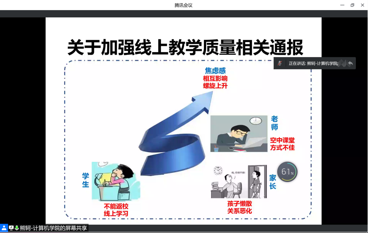 计算机学院对本科人才培养工作极为重视。5月12日上午,学院召开线上本科教学全员工作会议,所有院领导以及全院教师近150人参会。会议由副院长熊轲主持。