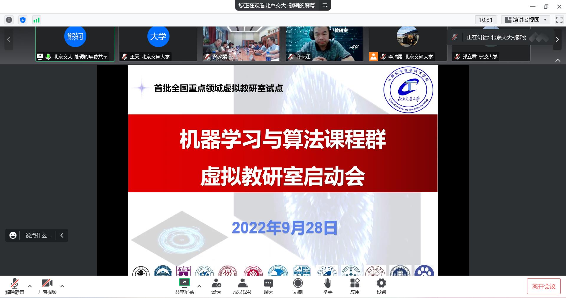 虚拟教研室带头人李清勇教授介绍了机器学习与算法课程群虚拟教研室的建设背景、前期基础以及建设思路,阐述了虚拟教研室建设的6大任务,重点介绍了优质立体化教学资源建设和新型教材建设2个核心任务和工作安排。KY开元集团官网入口计算机与信息技术学院副院长景丽萍教授分享了机器学习课程的建设情况,分享了机器学习课程思政的建设经验。在研讨环节,与会专家分享了本单位机器学习课程的建设经验,提出了虚拟教研室建设的宝贵意见。