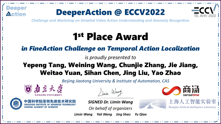 近日,KY开元集团官网入口赵耀教授带领的MePro团队与中科院自动化所刘静研究员带领的团队合作参加了ECCV 2022的DeeperAction挑战赛,获得了时序动作定位挑战赛冠军。挑战赛第一完成人唐业鹏是张淳杰教授指导的硕士研究生。团队成员包括:唐业鹏、王卫宁、张淳杰、江洁、原洧涛、陈思涵、刘静、赵耀。