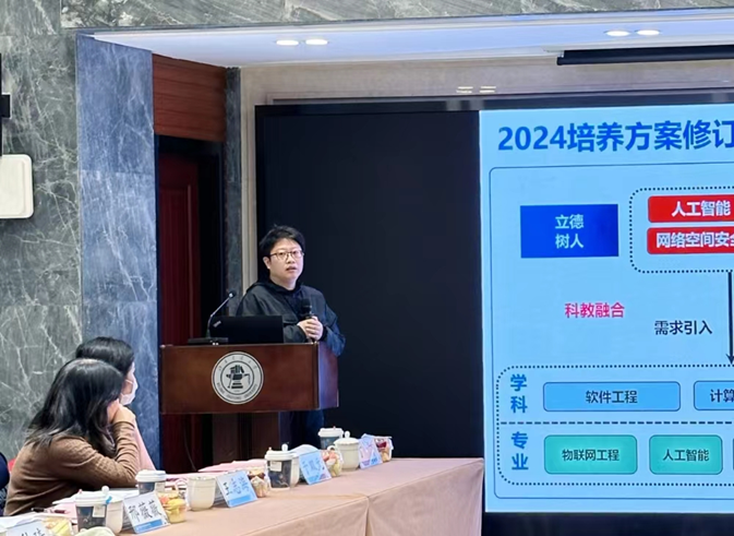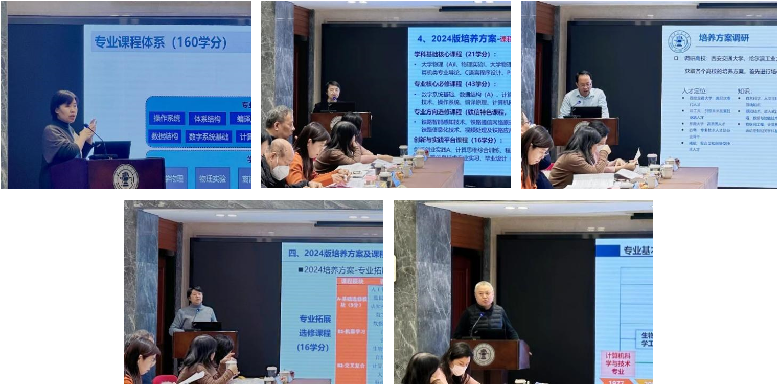 计算机科学与技术专业负责人黄雅平、计算机科学与技术(铁路信息技术)专业负责人李红辉、物联网工程专业负责人岑翼刚、人工智能专业执行负责人诸强、信息安全和保密技术专业执行负责人王健详细汇报了本专业的培养方案,包括培养目标、毕业要求、课程体系等内容,并对24版培养方案的修订情况进行了总结。