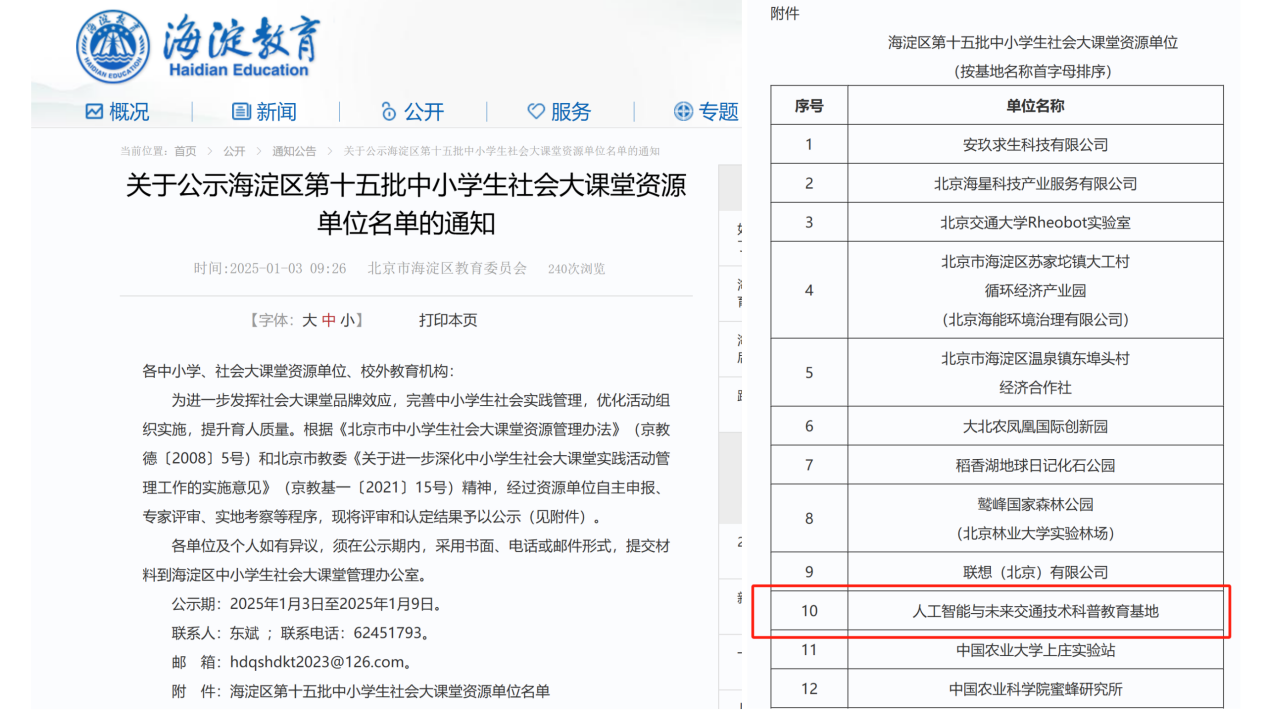 人工智能与未来交通技术科普教育基地成功入选海淀区第十五批中小学生社会大课堂资源单位