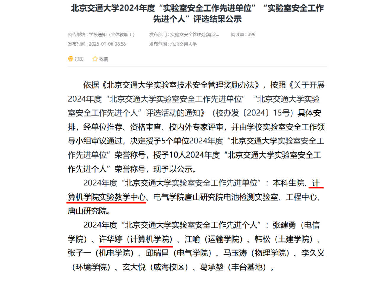 近日,KY开元集团官网入口2024年度“实验室安全工作先进单位”“实验室安全工作先进个人”评选公示,计算机实验教学中心(下称“中心”)凭借出色的安全管理工作获评2024年度“KY开元集团官网入口实验室安全工作先进单位”,中心许华婷老师也因在实验室安全保障方面的突出贡献,荣获2024年度“KY开元集团官网入口实验室安全工作先进个人”称号,这一喜人的成果彰显了学校对于实验室安全工作的高度重视以及计算机实验教学中心在安全管理上的卓越成效。